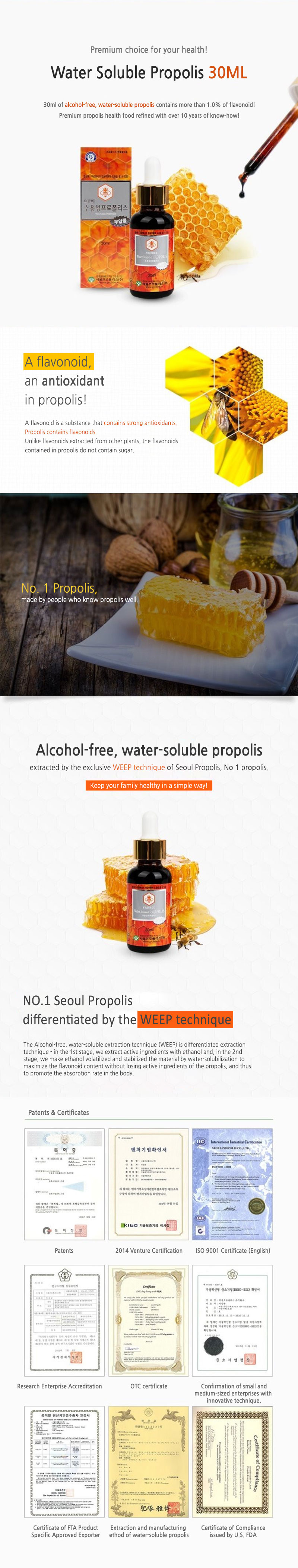 | Directions and Recommended Intake 3 times daily, take the recommended amount(0.648.ml) of the propolis using a dropper, and mix it with water, milk, juice or tea to meet your preferences. Cautions Check the best before date, and adhere to the recommended intake and directions. If you are an allergic person, check the ingredients before use. Be careful when opening or consuming the supplement as it's package may be sharp, that can cause an injury. |