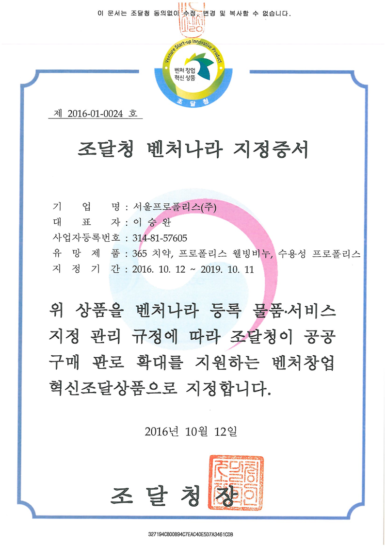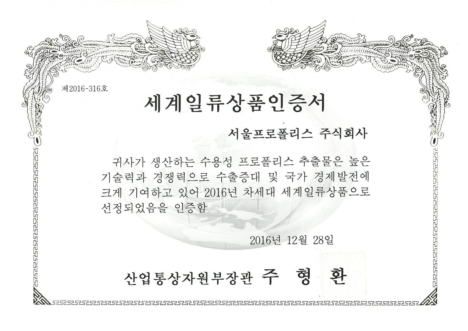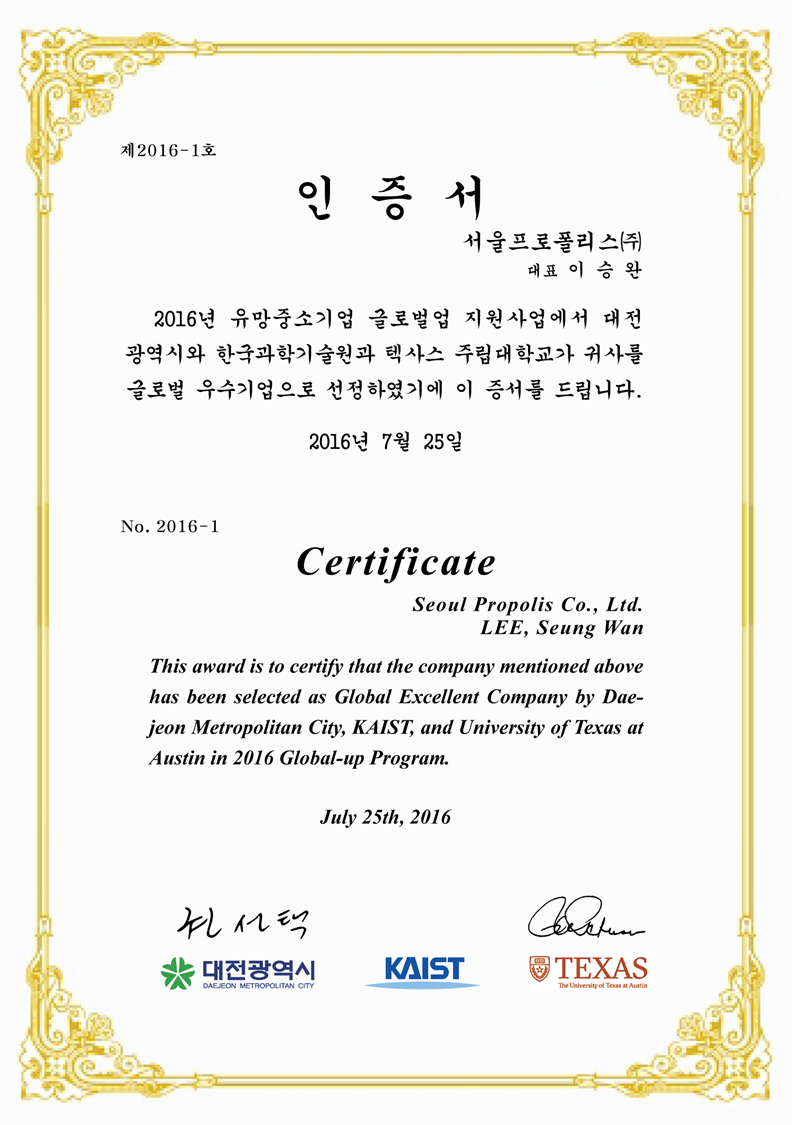 2016 Republic of Korea Global Excellent Company Selection Certificate