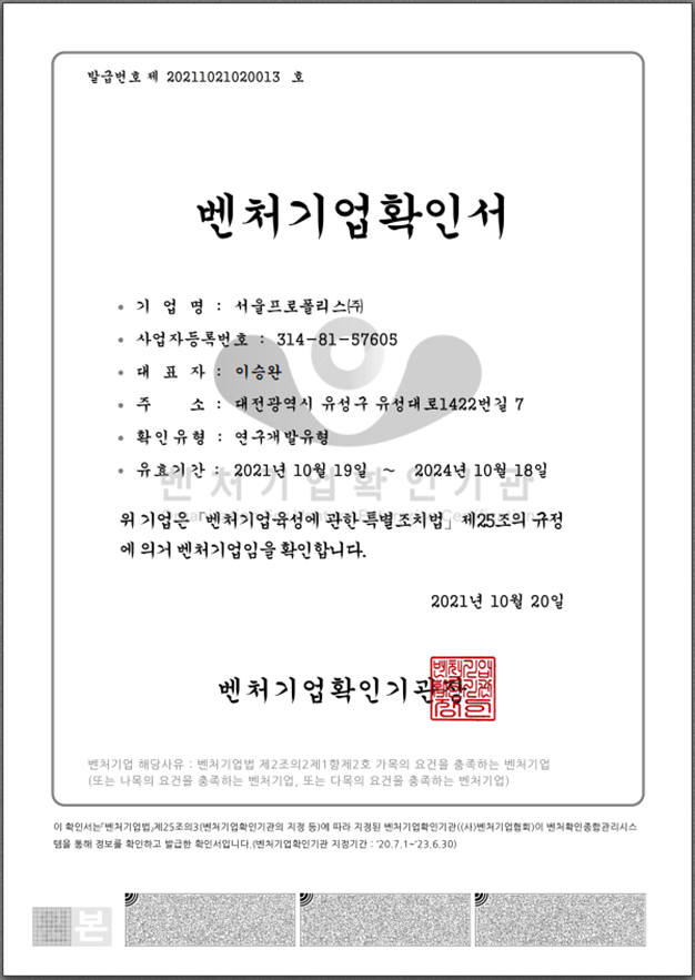 Venture Enterprise Confirmation Certificate