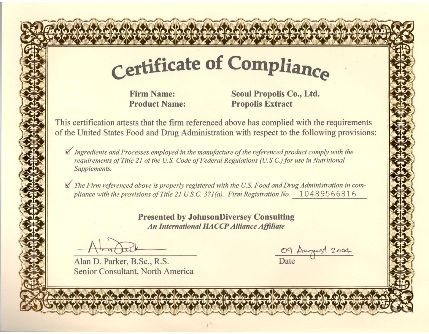 U.S. FDA Stability Approval and Factory Registration Certificate