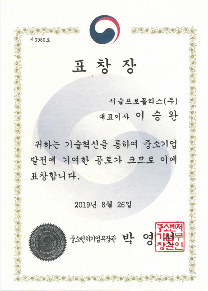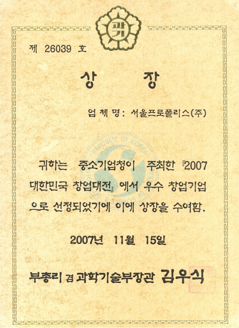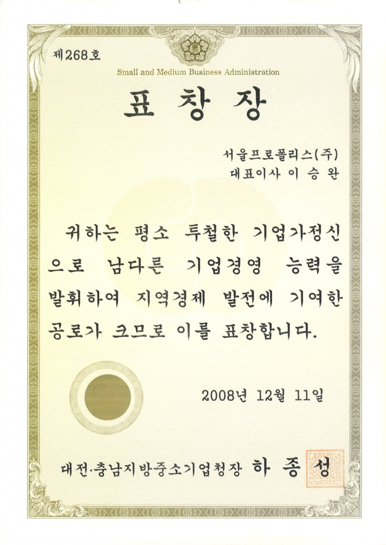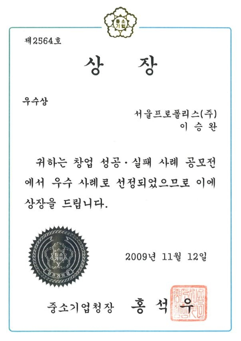 Entrepreneurship Commendation (DaejeonChungnam Regional Small and Medium Business Administration)