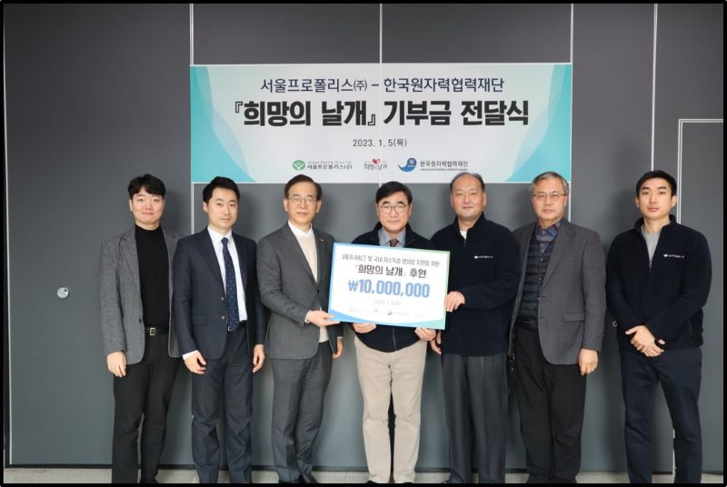 대전--(뉴스와이어) 2023년 01월 05일 -- 서울프로폴리스(대표 이승완)가 1월 5일 한국원자력협력재단에서 운영하는 국내·외 암 치료 지원사업 ‘희망의 날개’에 후원금 1000만원을 전달했다.