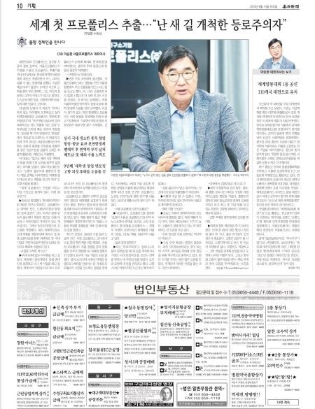 계기가 있었다. 2002년 가을 일본 도쿄역 인근 서점 프로폴리스 코너에서 수십 권의 관련 책을 뒤질 때였다. 수용성 프로폴리스 추출 공법을 중국 양봉협회 간부가 개발했다는 내용을 접했지만 로열티 요구에 기술 개발로 눈을 돌렸다. 결국 2017년에 수용성 칵테일 공법으로 3세대를 선보이는 등 국내외 프로폴리스 시장을 선도하는 결실을 얻었다. 지난해에는 4세대 기술 초임계 칵테일 공법을 이용해 충남대학교 병원과 함께 4년간 공동 연구한 '프로폴리스 노인성 인지기능에 관한 연구'를 내놓았다. 2027년 매출 500억 원이 단기 목표다.