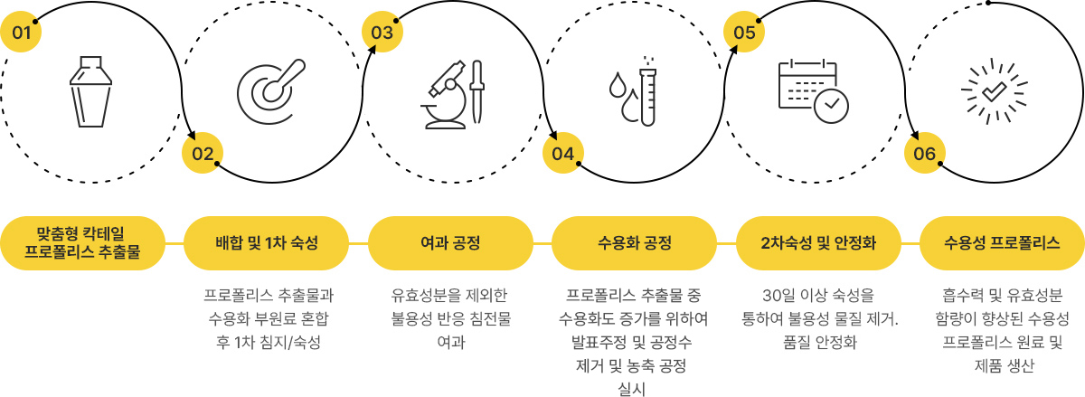 기존 에탄올 추출법은 프로폴리스가 가지고 있는 강한 향과 제거되지 않는 왁스로 인해 끈적거림이 심하고 입이나 컵 등에 달라붙어 잘 지워지지 않는 불편함이 있었습니다. 저희 서울프로폴리스는 이러한 불편 사항을 개선하기 위하여 WEEP 공법을 고안하였습니다. WEEP 공법에 의한 수용성 프로폴리스는 물에 완전히 용해되어 프로폴리스 고유의 갈색을 띄며 입이나 컵 등에 수지나 왁스가 달라붙지 않고 맛과 향이 부드러우며, 고분자 플라보노이드와 수지를 저분자화 하여 체내 흡수율을 높여줍니다.
