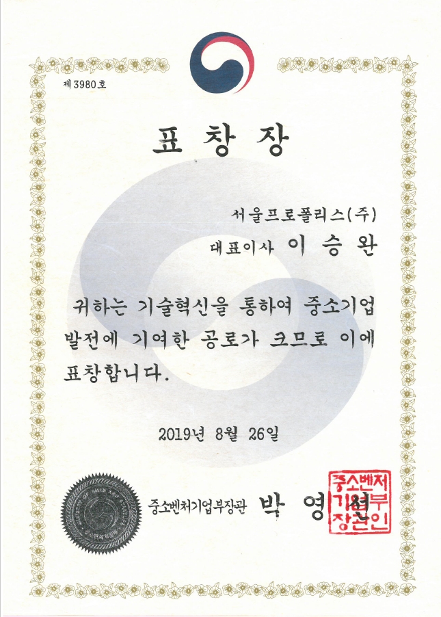 기술혁신 중소기업 발전 표창장 (중소벤처기업부)
