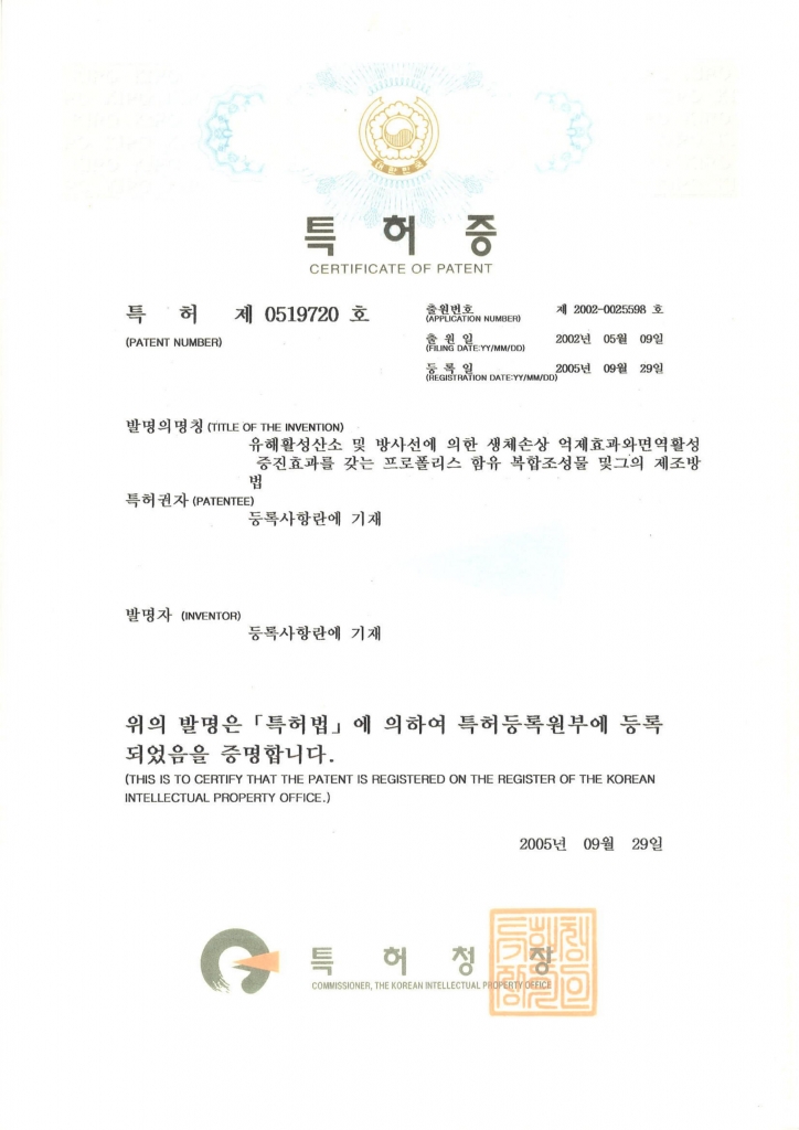 유해활성산소 및 방사선에 의한 생체손상 억제효과와 면역활성 증진효과를 갖는 프로폴리스 함유 복합조성물 및 그 제조방법에 대한 특허