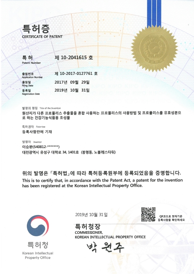 원산지가 다른 프로폴리스 추출물을 혼합 사용하는 프로폴리스를 유효성분으로 하는 건강기능식품용 조성물에 대한 특허