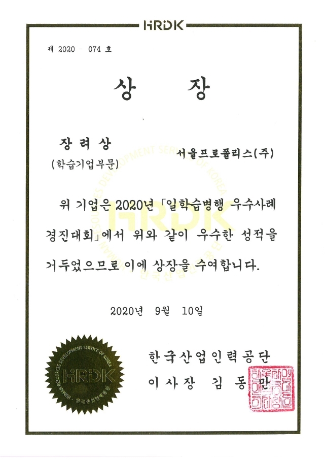 일학습병행 우수사례 경진대회 장려상 수상 (한국산업인력공단)
