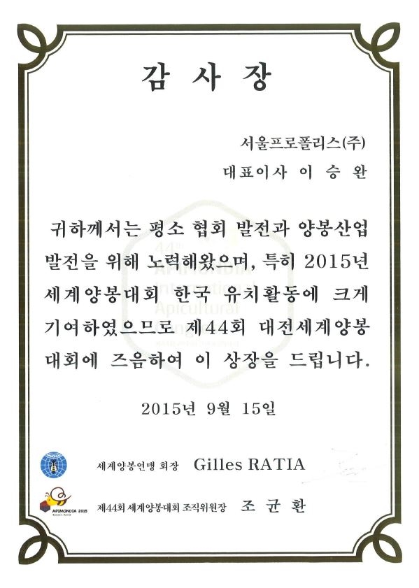 2015 세계양봉대회 한국 유치활동 감사장