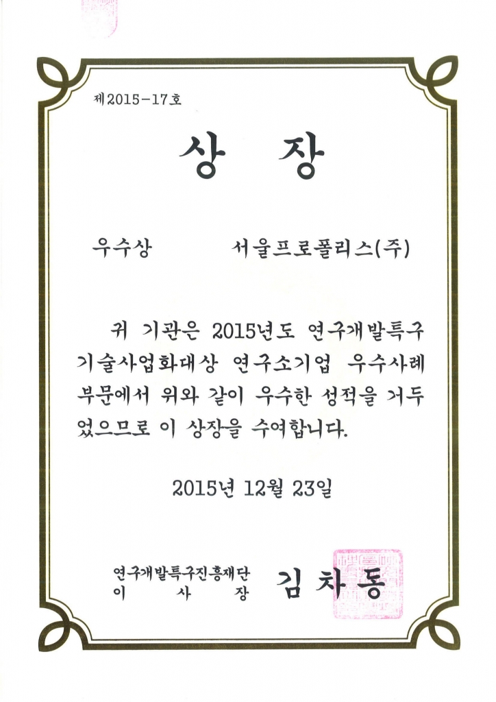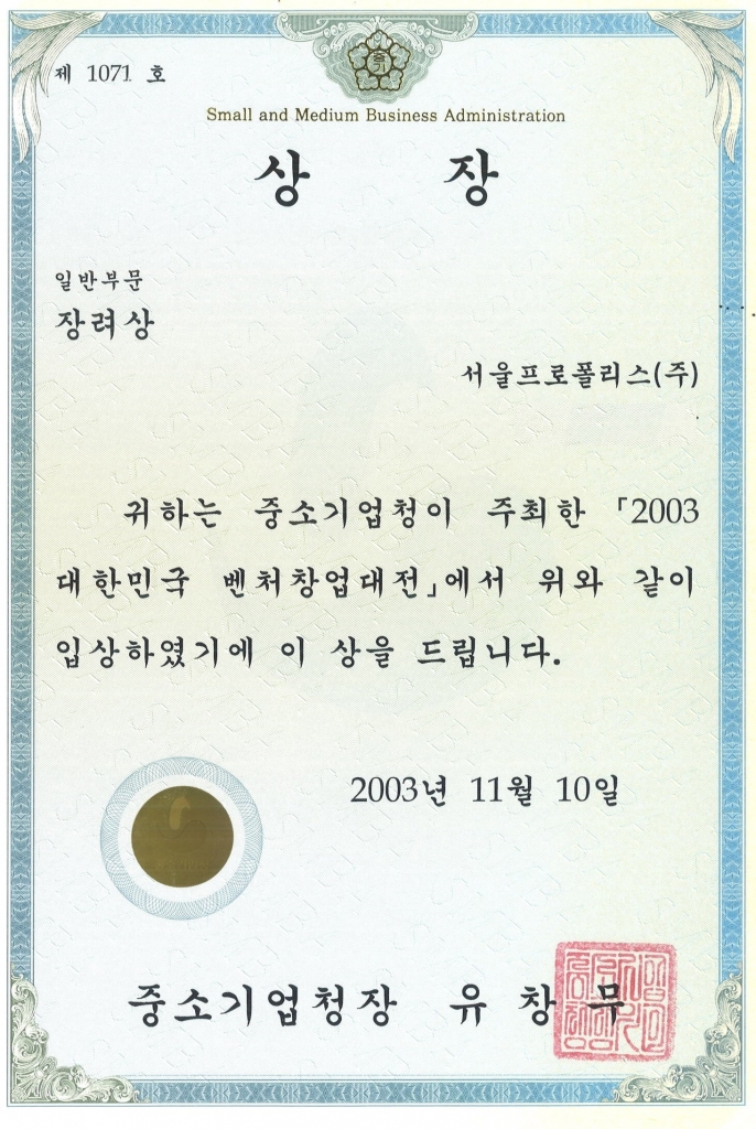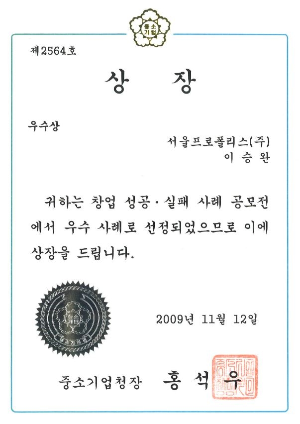 중소기업청장 상장 수상