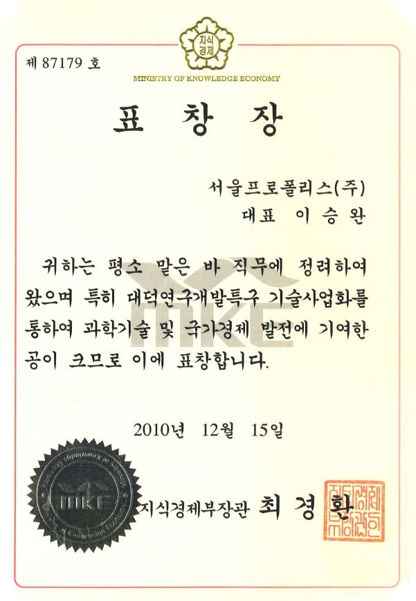 대덕연구개발특구 기술사업화 표창장 (지식경제부)