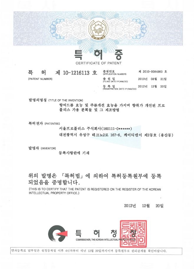 수용성 프로폴리스 제조방법에 대한 특허 (일본)