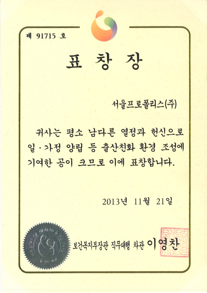일·가정 양립 출산친화 환경 조성 표창장 (보건복지부)