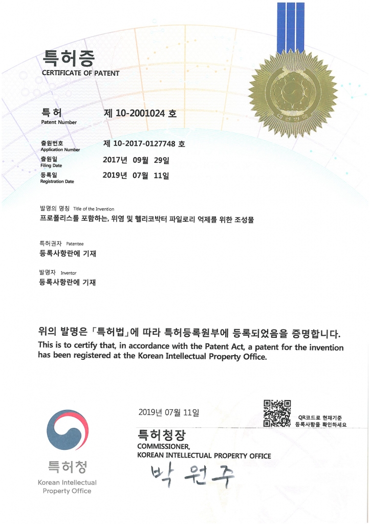 프로폴리스를 포함하는 위염 및 헬리코박터 파일로리 억제를 위한 조성물에 대한 특허