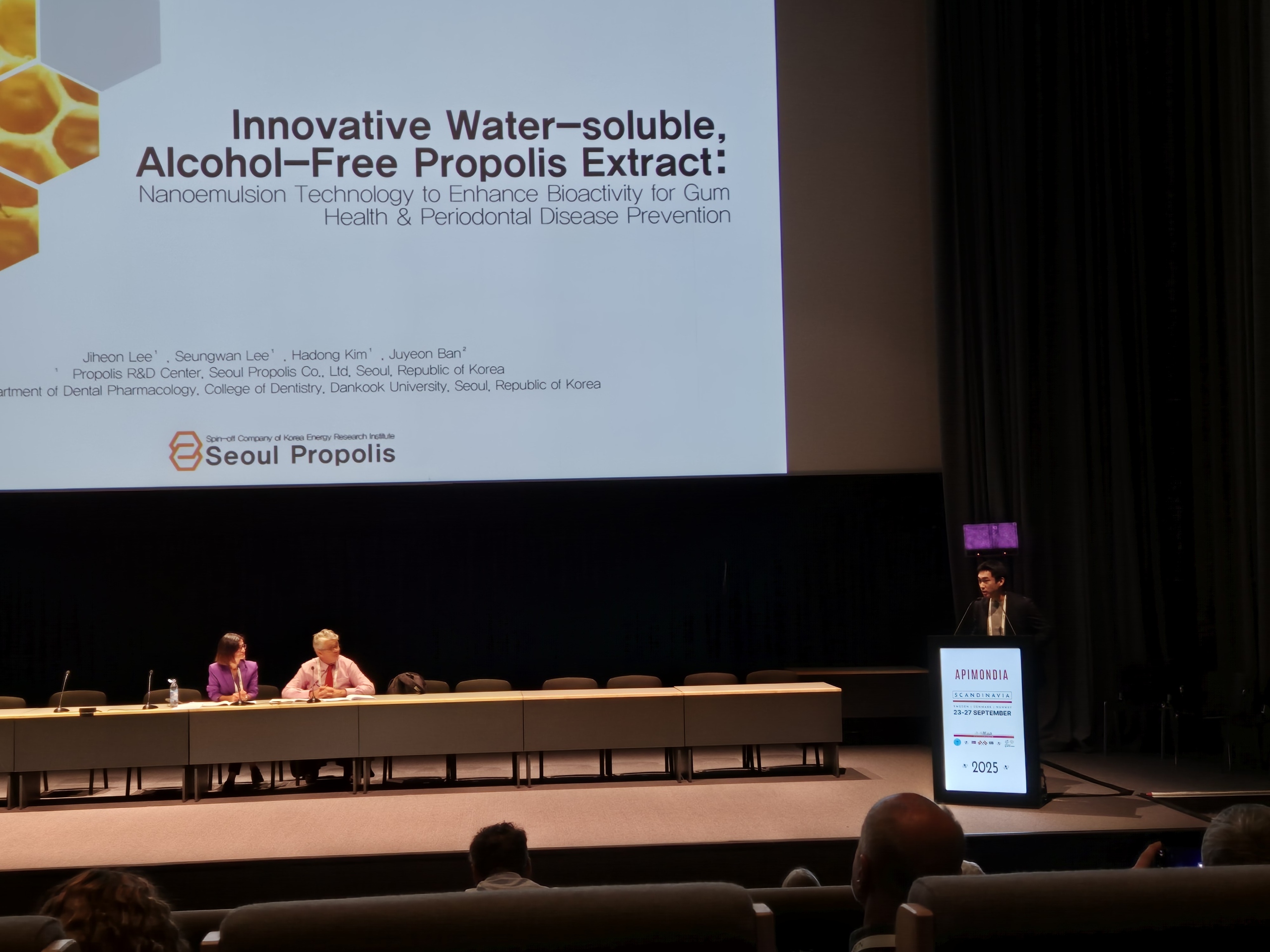 전체 분과의 포스트 발표만 600여편과 대체의학(Apitherapy) 분야의 논문만 110편 중 오랄 발표는 37편만 선정되었는데 한국에서는 유일하게 당사 이지헌 상무가 “나노에멀젼 수용성 프로폴리스(N-WEEP@)기술 개발의 구강내 항염증 효과의 구강건강” 발표로큰 관심을 끌었다.