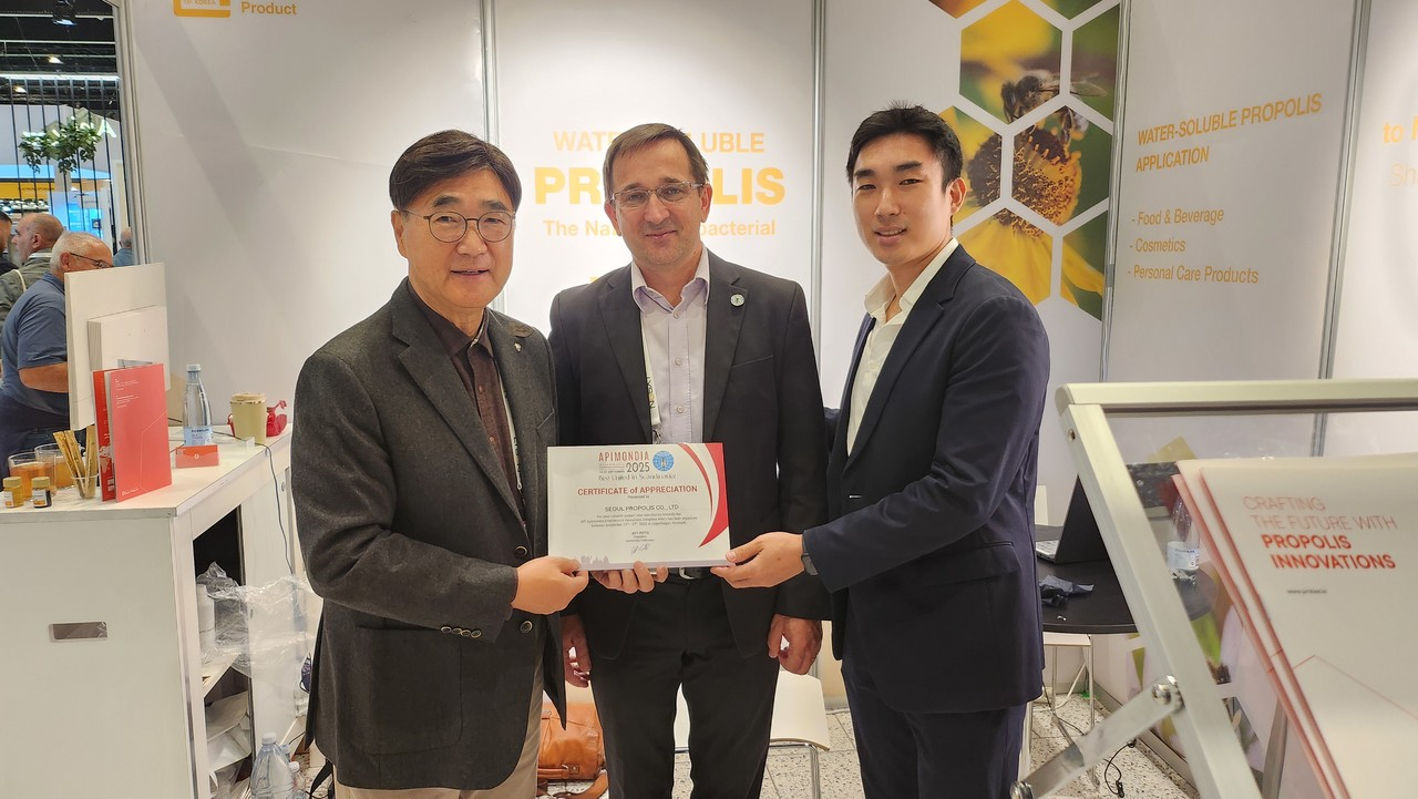 우리 회사는 2005년 대회 이후부터 한국 기업으로 유일하게 부스 참가와 수용성 프로폴리스 기술을 세계화하는데 꾸준히 연구 발표했다. 그 공로를 인정 받아 이번 대회에서 국제양봉협회 회장으로부터 감사장을 받았다.